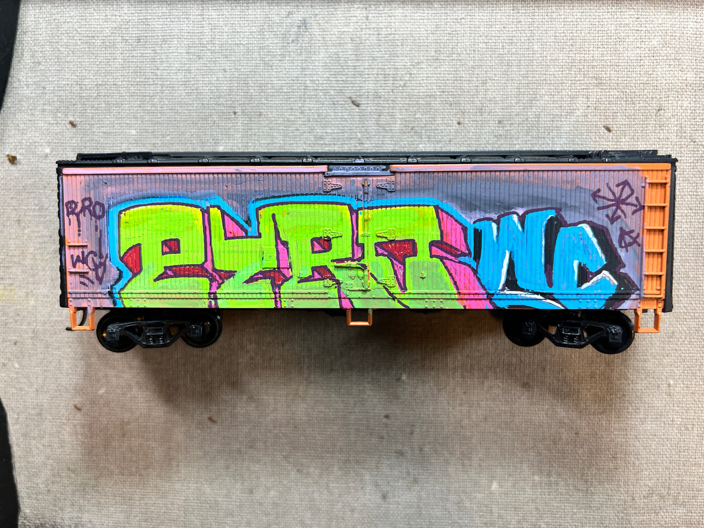 The NEW trains are (finally) here.. All are HO scale unless otherwise noted. These are rolling stock that will roll in your line or just look good on a shelf. Both sides are lightly weathered and painted (2nd side is a surprise! It could be a burner, it could be straight letters, maybe a row of throwies, or possibly a whole car…that’s the surprise!)