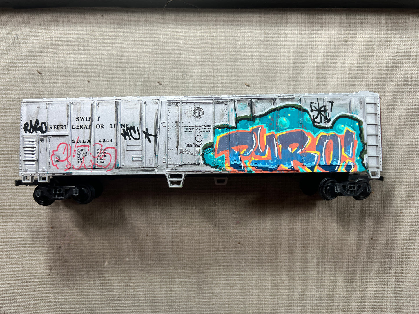 The NEW trains are (finally) here.. All are HO scale unless otherwise noted. These are rolling stock that will roll in your line or just look good on a shelf. Both sides are lightly weathered and painted (2nd side is a surprise! It could be a burner, it could be straight letters, maybe a row of throwies, or possibly a whole car…that’s the surprise!)