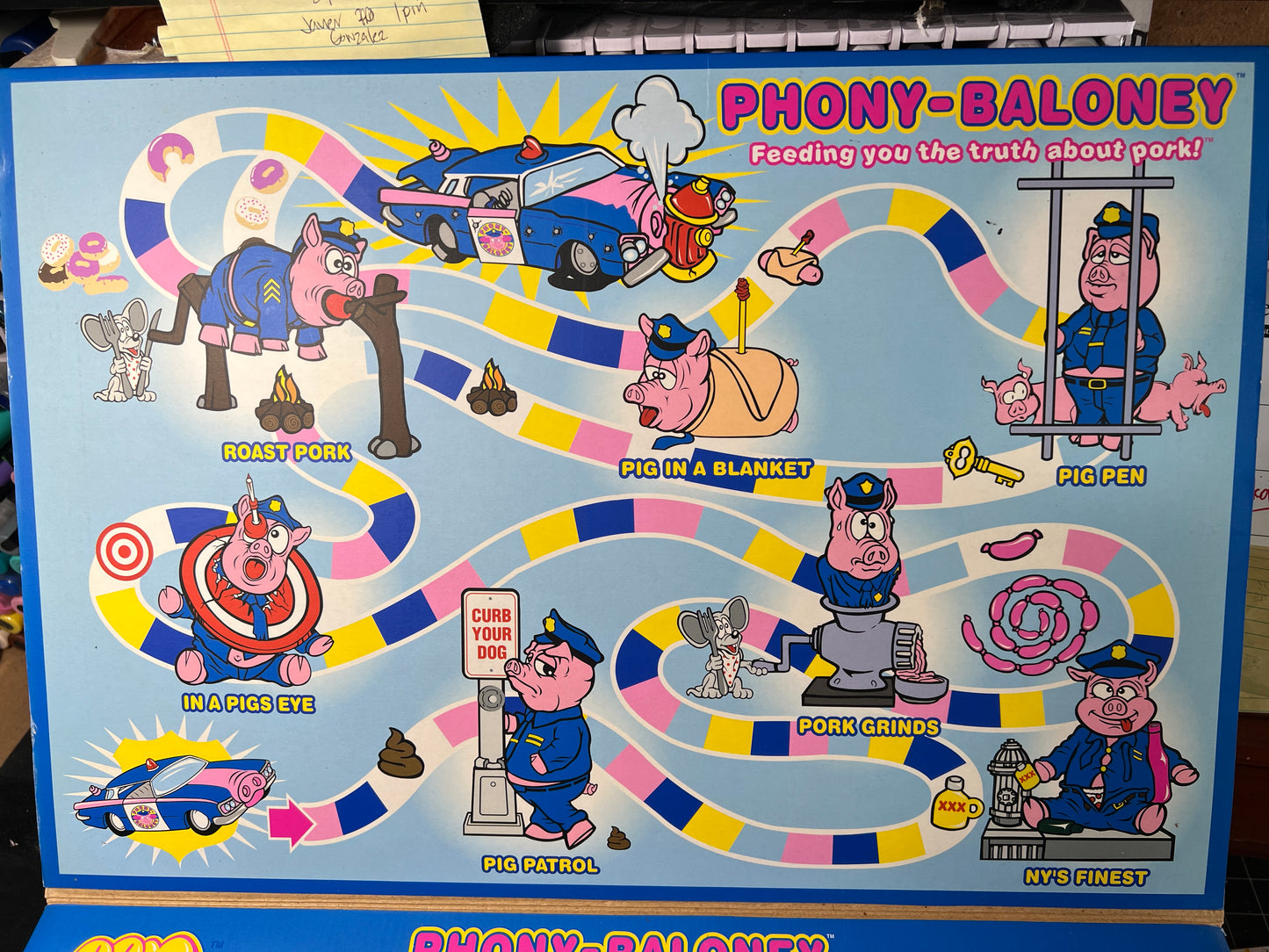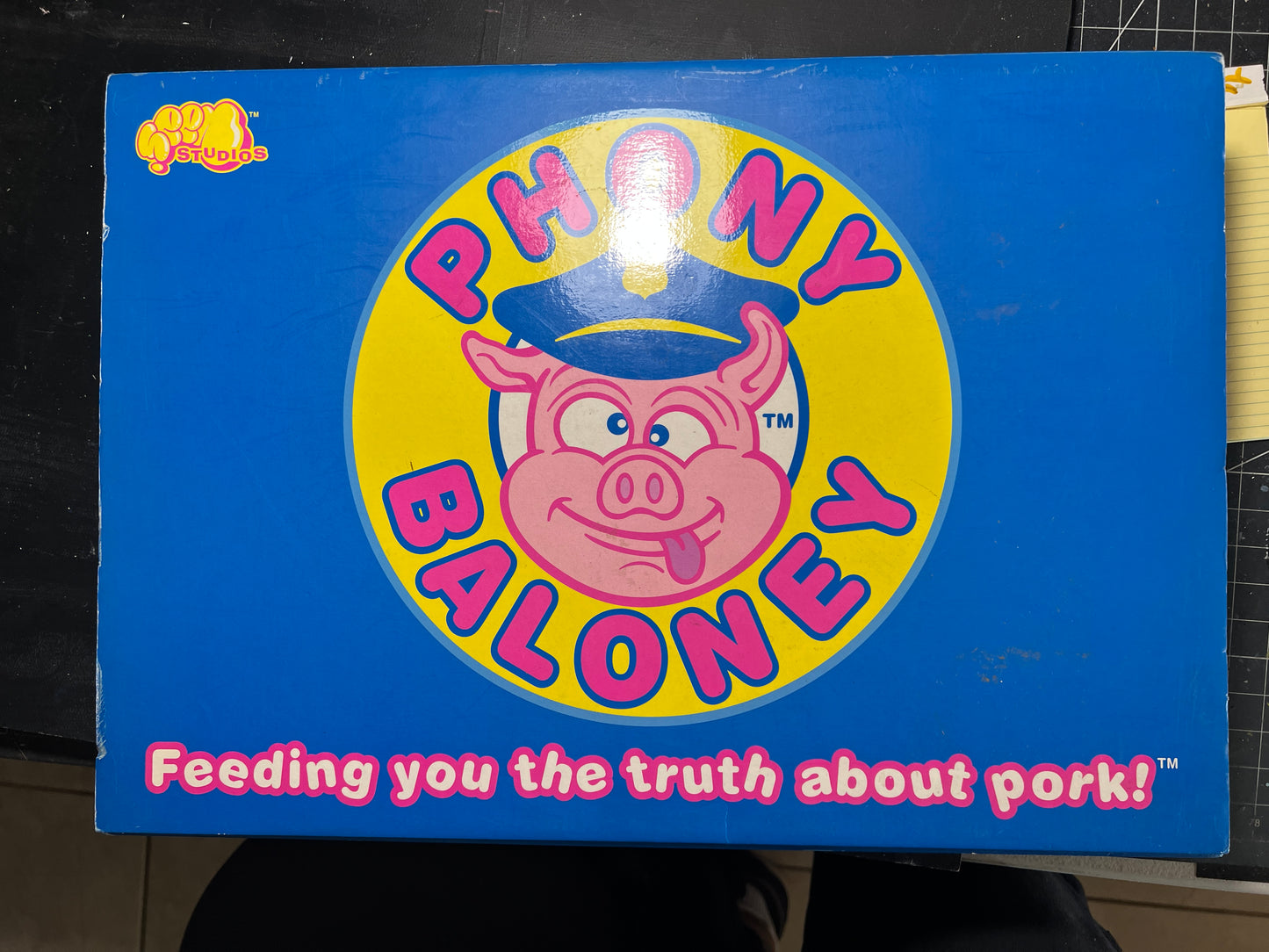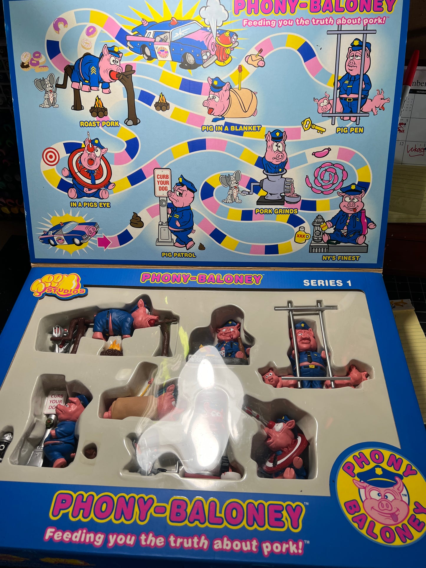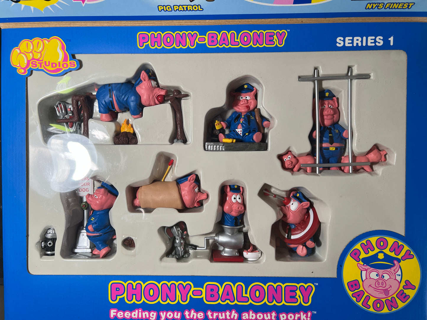 Series 1 full set of Seens Phoney Baloney pig character toys in game board box. Large 19 1/2 x 14 x 3 1/4